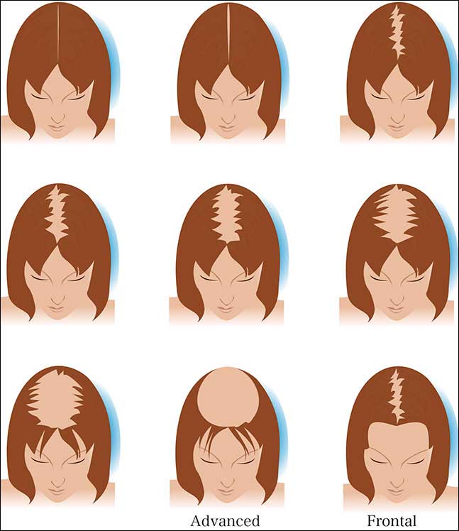 In women, FPHL usually begins as a noticeable widening of the part line, with some recession of the hairline, especially in the temple area. Some women first notice that they have a thinner ponytail and are not able to style their hair the way they want. As time progresses, there is variable expression of the gene, such that there is progressive thinning mainly on top of the head at different rates of speed.
